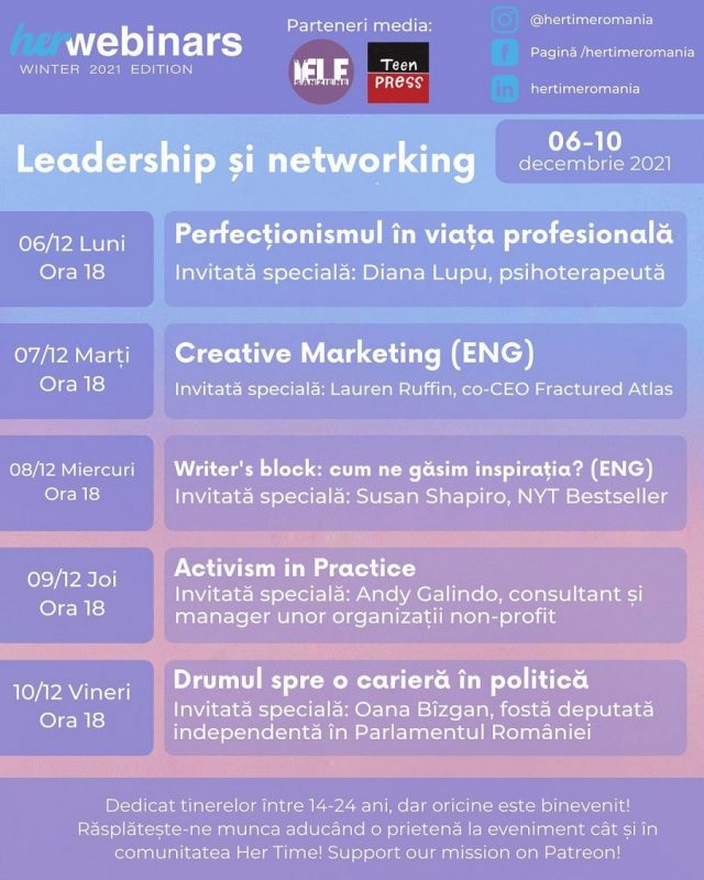 Printre subiectele acestei ediții se numără: perfecționismul în viața profesională, marketingul creativ, blocajele în procesul de scriere, activismul în practică și drumul spre o carieră în politică. Toate cele cinci ateliere vor fi susținute zilnic, începând cu ora 18, de invitate din țară: Diana Lupu, psihoterapeut și Oana Bîzgan, fostă deputată independentă în Parlamentul României, și din străinătate: Lauren Ruffin, co-CEO Fractured Atlas, Susan Shapiro, NYT Bestseller și Andy Galindo, consultant și manager a unor organizații non-profit. „La sfârșitul webinarului ne dorim ca participanții să rămână cu un networking creat, un plus de încredere și siguranță legat de drumul pe care îl urmează și cu o serie de sfaturi pe care le pot folosi activ în viața lor de zi cu zi”, ne-a declarat echipa HerTime.