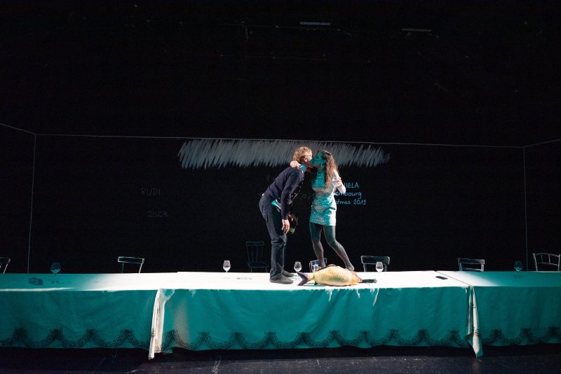 Decorul minimalist, realizat de Isabel Graf, este compus din trei mese, care reunite alcătuiesc o unică masă mare, sugerând atât conectarea poveștilor între ele, cât și colaborarea între cele trei teatre la realizarea proiectului. În fundal se poate observa o tablă pe care sunt notate pe parcursul spectacolului numele protagoniștilor și anul în care se petrece acțiunea. Mediul din care provin personajele se reflectă și în ținuta lor, mai ales în cazul femeilor. Bluzita cuminte cu guleraș și buline, fusta midi și părul împletit al Marianei sunt tipice pentru o fată modestă, crescută în comunism. Rochia mulată, sclipitoare, și cerceii mari ai Danielei pot fi asociate momentului festiv al Crăciunului, dar și atracției ei pentru lumea showbiz-ului, aspirației de a deveni o cântăreață celebră. Prin vestimentație și coafură Sophie oferă imginea unei femei de vârstă mijlocie, sigură pe sine. La polul opus, Darius, cu care ea are o aventură, apare la un moment dat îmbrăcat într-un costum de iepuraș, ce exprimă imaturitatea, nevoia de a mai copilări. De altfel, relația dintre cei doi tocmai pe acest schimb se bazează: alături de el ea se simte mai tânără, în timp ce pentru el, ea este un substitut al mamei.