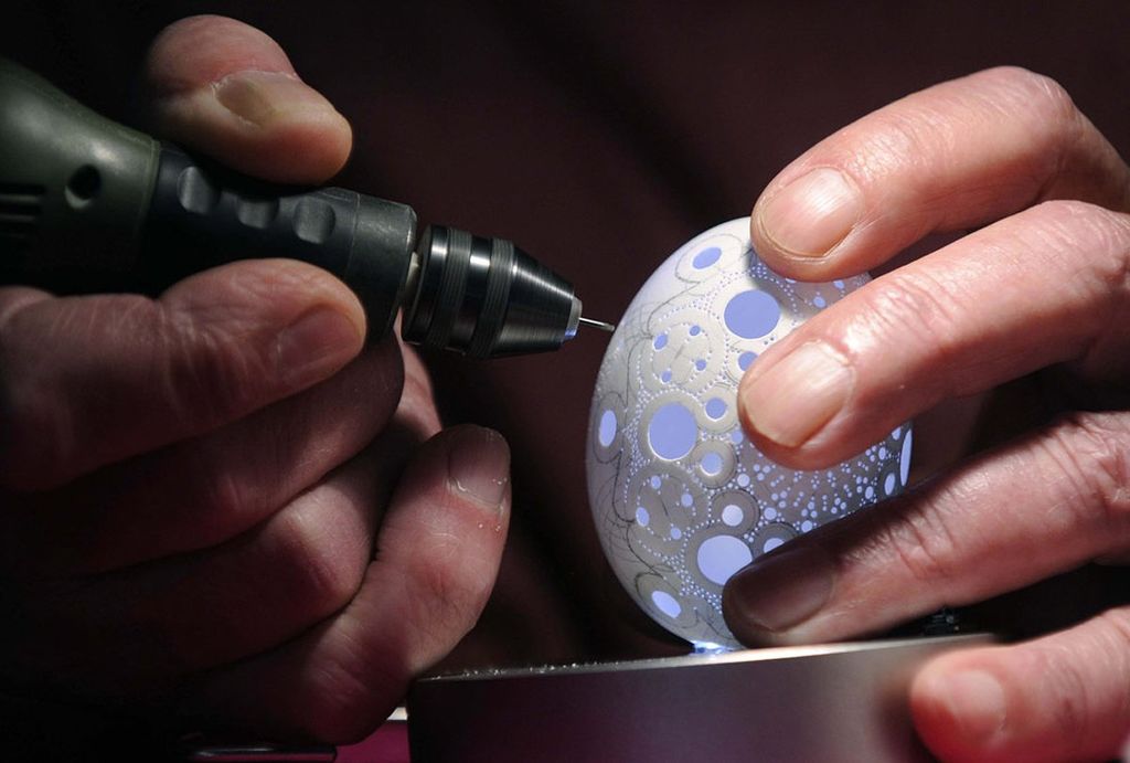 În Stara Vrhnika, aproape de capitala Sloveniei, Ljubljana, un pensionar folosește coaja de ou pe post de canava. Franc Grom, inspirat de motive tradiționale slovene, la ai săi 75 de ani, găurește cu o bormașină minusculă adevărate capodopere.