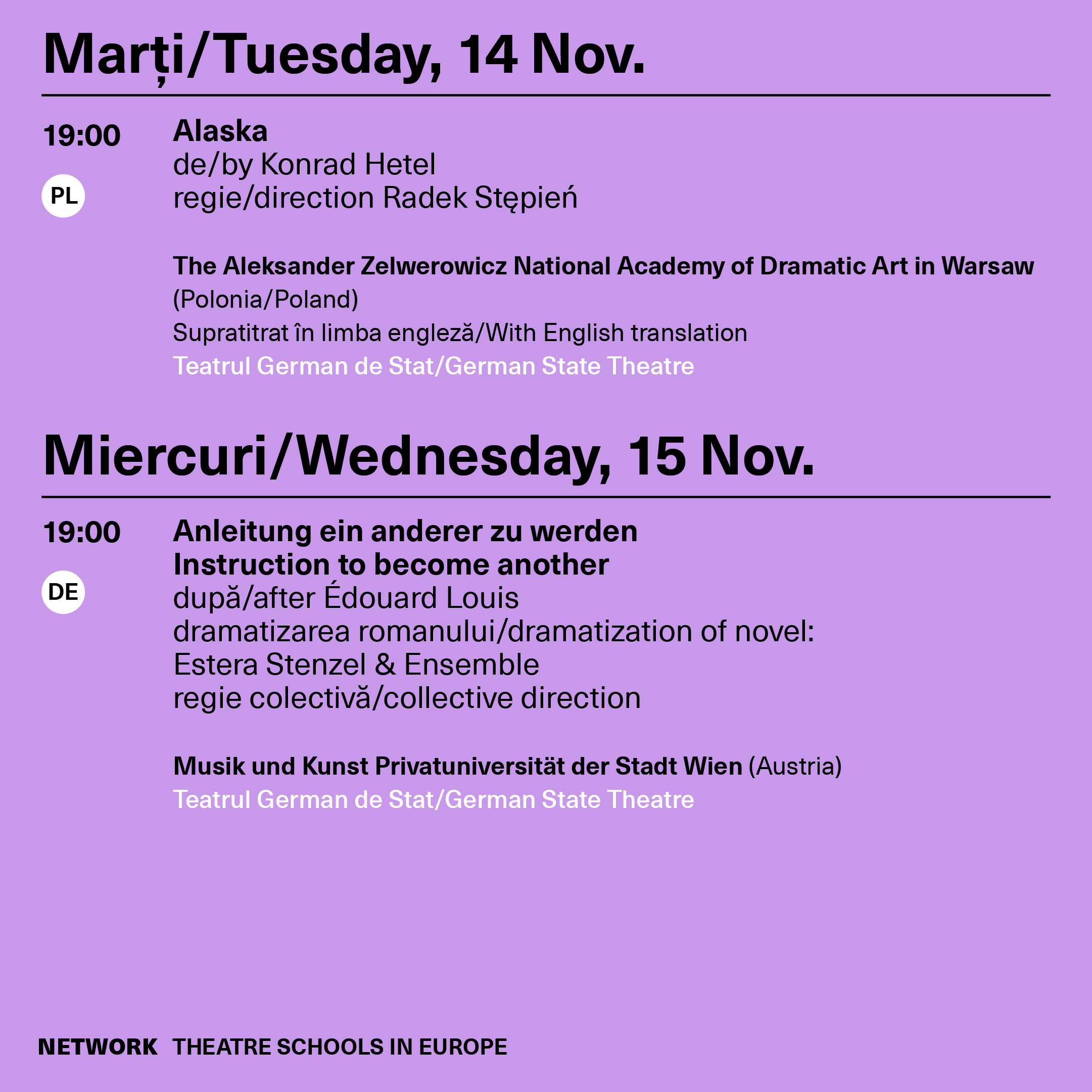 Este vorba de facultăți și academii de teatru și artele spectacolului cu discursuri artistice puternice și metode de lucru diferite, care vor prezenta în Timișoara spectacolele alese în urma unei selecții efectuate de echipa curatorială a evenimentului – Alina Mazilu și Florin Vidamski. La spectacolele invitate se adaugă producția realizată, într-un spațiu neconvențional, de Specializarea Artele Spectacolului – Actorie în limba germană a Facultății de Muzică și Teatru (UVT), pornind de la textul lui Peter Handke Ora la care nu știam unii de alții, în regia lui Florin Vidamski.